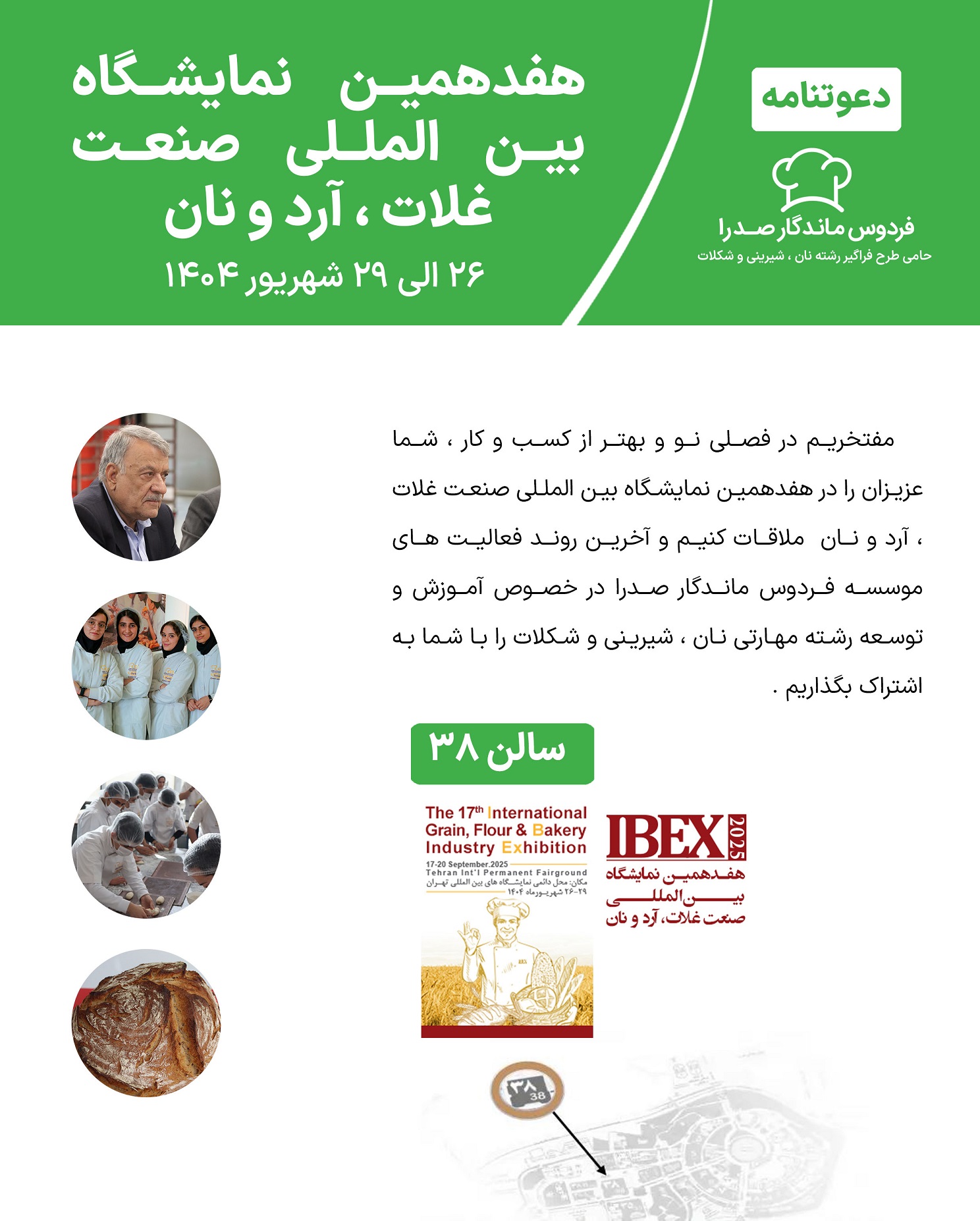 از افتخار میزبانی شما عزیزان درهفدهمین نمایشگاه بین المللی نان و بیست و چهارمین نمایشگاه شیرینی و شکلات ایران از تاریخ ۲۶ الی ۲۹ شهریورماه ۱۴۰۴ بسیار خوشحال شدیم.…